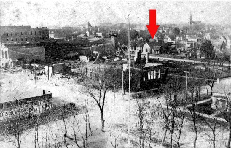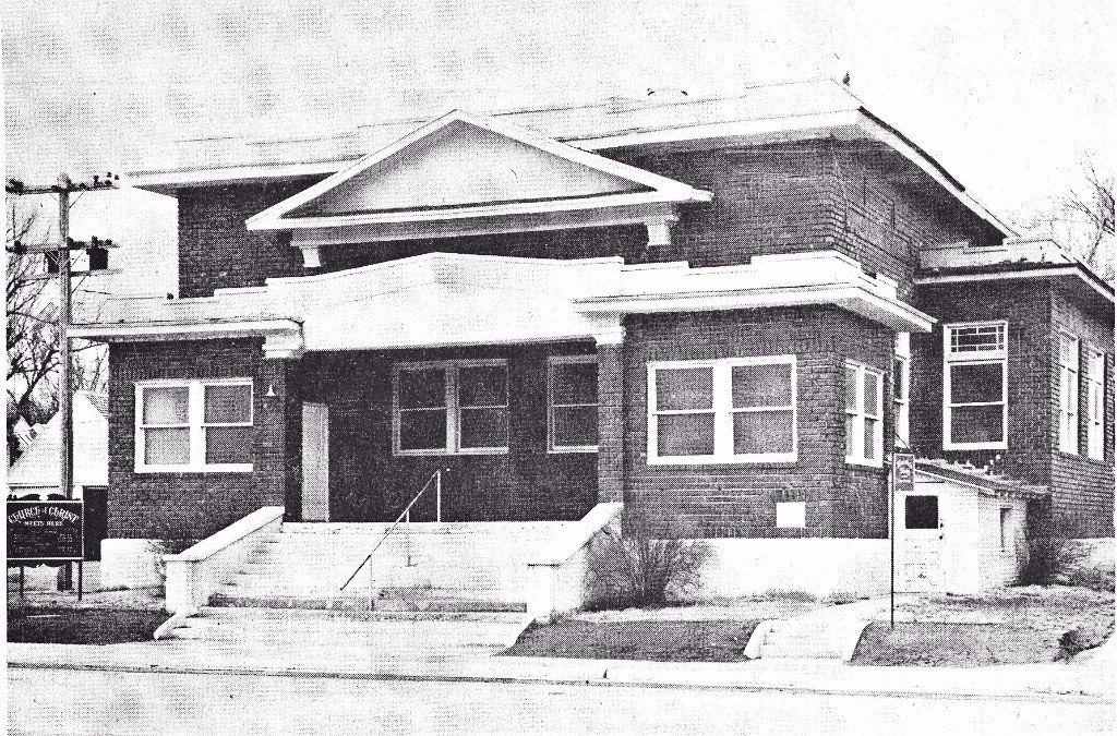 If you have ever wondered about the corner stone embedded in the sidewalk leading up to our present church building, here is the story: Our first church building in Parsons, Kansas, was located downtown at 1721 Washington Avenue, and served as our meeting house from 1894 until 1919, when a new building was erected for our congregation at 2611 Main Street. The corner stone memorializing our first permanent church house was installed in that new building (circled in the first photo). At some point following the construction of our present building in 1965, the corner stone was moved and embedded in our present sidewalk, where it remains to this day.